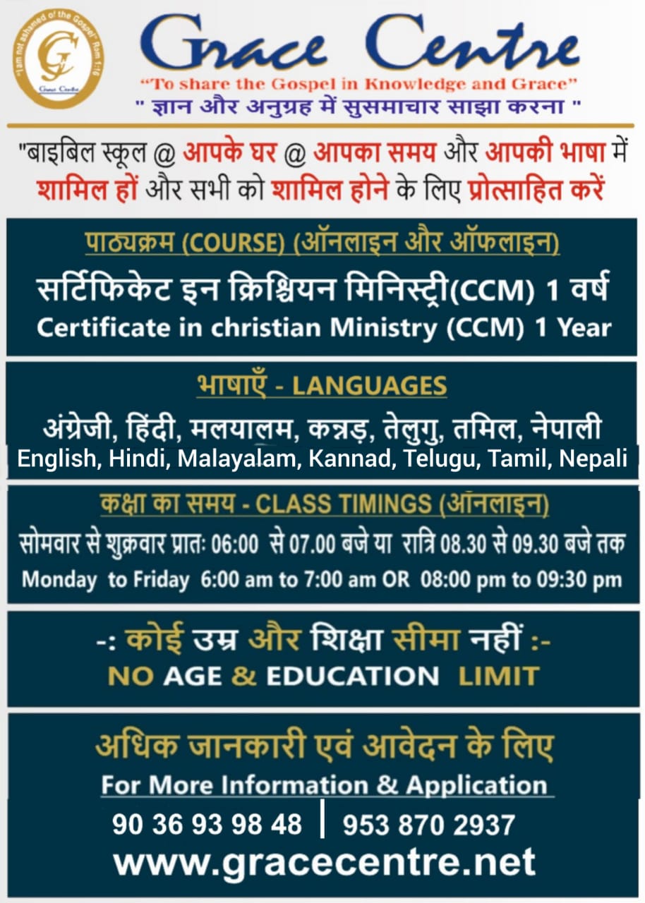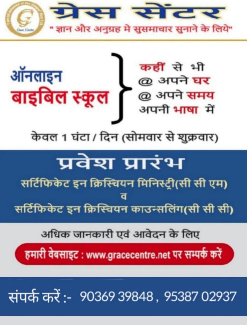 Grace Centre is an Inter-denominational christian ministry, started with a vision to equip and encourage people To share the Gospel in Knowledge and Grace. The concept of Grace Centre is Bible school at your door-step. we open training centres on need basis.